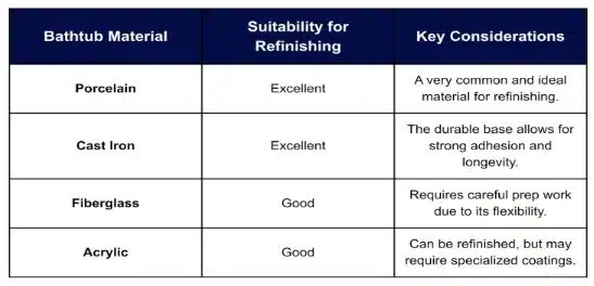 Here’s a quick look at common materials suitable for bathtub refinishing: