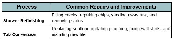 In a conversion, repairs are structural. With the shower removed, it becomes the ideal time to address water damage, replace weakened subfloor areas, update plumbing lines, or improve insulation. These deeper improvements cannot be achieved with surface refinishing alone.